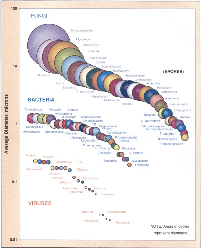 Our human nature wants tangible, visible evidence of threats to our persons. This works to our good when a threat is a reckless driver or a pothole in a road. But airborne pathogens are invisible threats. The graphic depicts the relative sizes of a wide range of these threats from fungi spores to tiny viruses.
