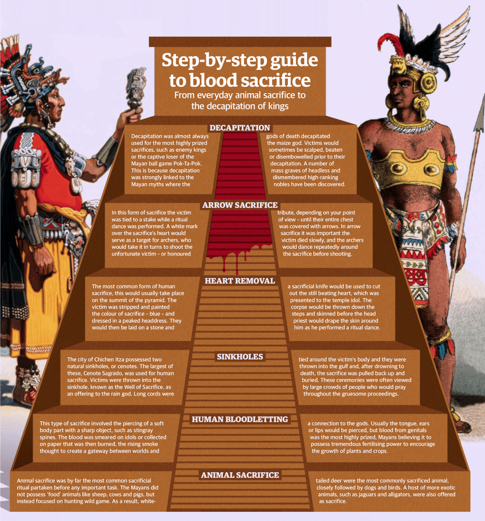 The Mayan, Aztec, and Inca people all practiced human sacrifice. See images below.