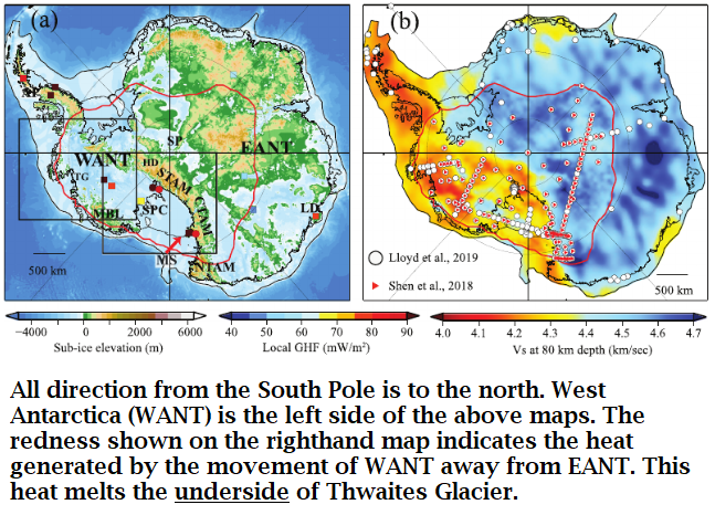 The heat from the earth flows outward at a rate of 65 milliWatts per square meter all over the world. The hotspot beneath Thwaites Glacier is exceptional. I quote: “The minimum average heat flow beneath Thwaites Glacier is 114 milliwatts per square meter (or per about 10 square feet) with some areas giving off 200 milliwatts per square meter or more …”