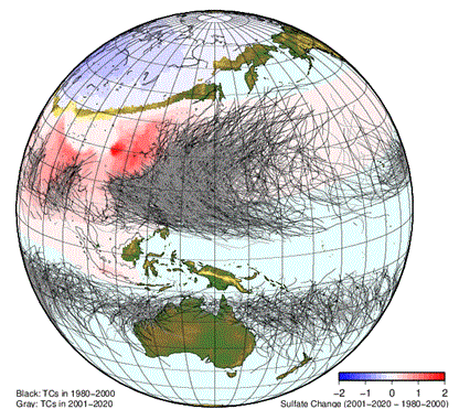 “Over the last 40 years, Europe and North America have been leaders in reducing particulate air pollution from industry, autos, energy and other sources. The increasing absence of human-caused air pollution in the Northern Hemisphere, estimated to be a 50-percent drop in concentration from 1980 to 2020, has led to surface warming over the tropical Atlantic Ocean, which contributes to more frequent tropical cyclones. Without significant amounts of particulate pollution to reflect sunlight, the ocean absorbs more heat and warms faster. A warming Atlantic Ocean has been a key ingredient to a 33-percent increase in the number of tropical cyclones during this 40-year period, Murakami said.”
