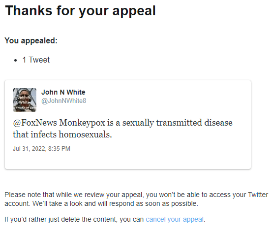 On July 31, 2022, Fox News posted a story on monkeypox, a highly infectious disease. The Twitter censors immediately blocked my account. Twitter offered to unblock my account if I would simply delete the comment. I did not delete it because the only way I could delete it would be for me to bow to the censors in order to reopen my Twitter account to delete the comment.