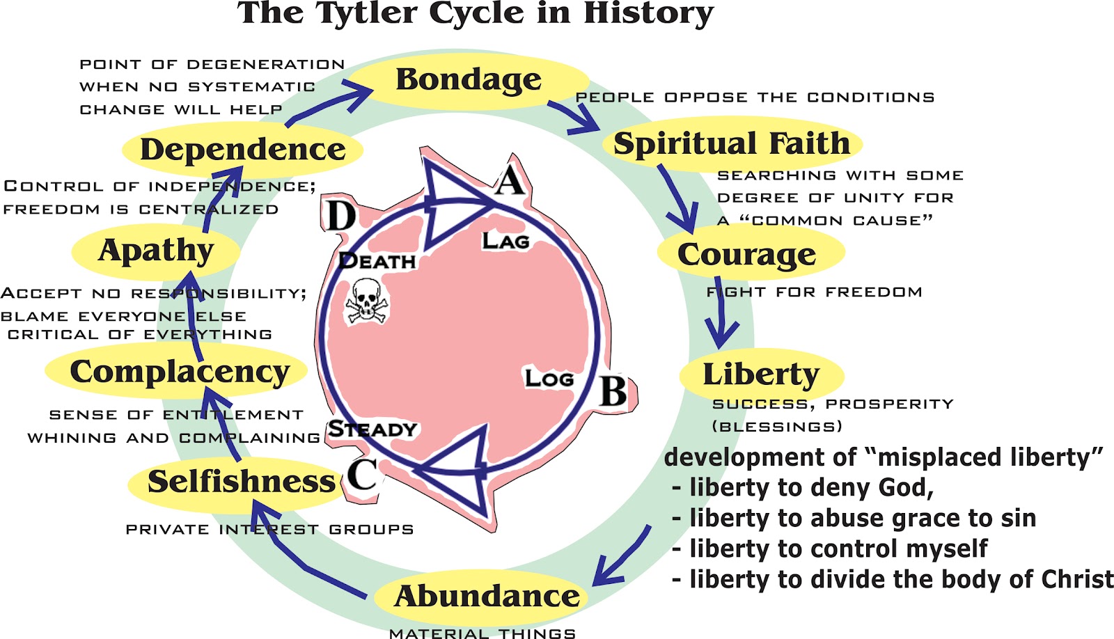 You may be familiar with the Tytler Cycle of Democracies posited by Alexander Fraser Tytler, Scotsman, scholar, lawyer, judge, university professor, and a Believer in Jesus Christ.