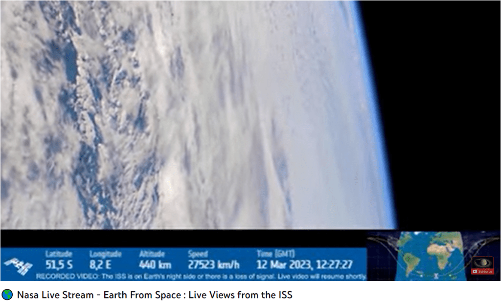 Answer: The oceans, seas, and bays. Clouds cover the earth. View the NASA Live Stream – Earth From Space: Live Views from the ISS.