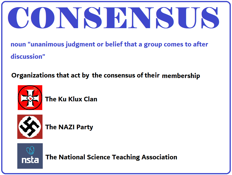 On the subject of climate change, the National Science Teaching Association (NTSA) conflates the scientific method with consensus. From the NTSA website introduction: “The National Science Teachers Association (NSTA) acknowledges that decades of research and overwhelming scientific consensus indicate with increasing certainty that Earth’s climate is changing.”