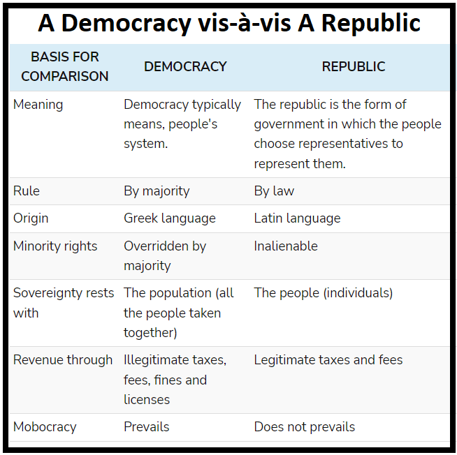 The singular and most important difference is the form of government. A democracy is ruled by a simple majority. A republic is ruled by laws that protect the rights of the individual, hence the Bill of Rights.