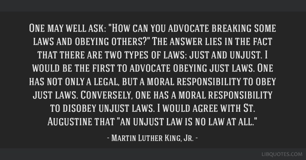 I concur with Martin Luther King, Jr. We are not obligated to obey unjust laws and unjust bureaucratic rules.