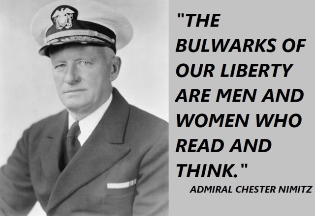 Admiral Chester Nimitz wisely stated, “The bulwarks of our liberty are men and women who read and think.“