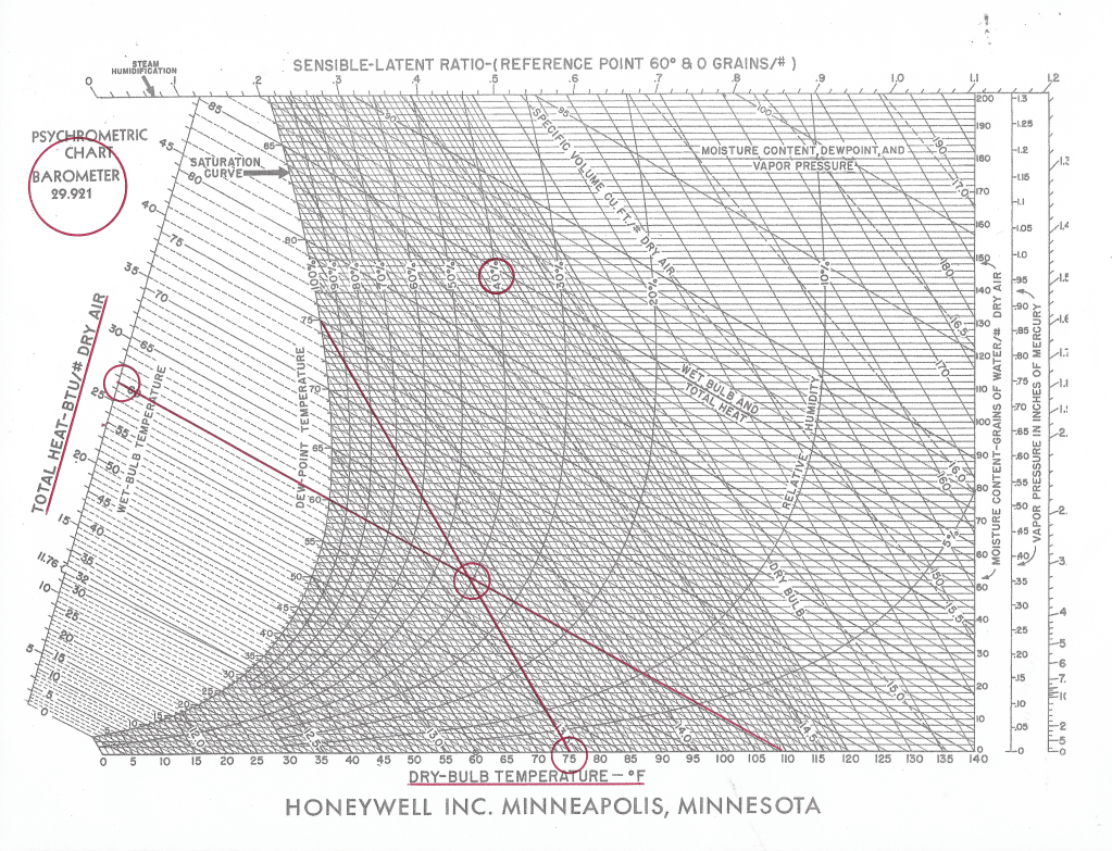 In the chart above, the atmospheric variables illustrated are 75°F dry-bulb temperature, 40% RH (relative humidity, and barometric pressure of 29.991 inches Hg (Mercury). These conditions indicate an enthalpy of approximately 26.5 BTU/lb. Dry Air.
