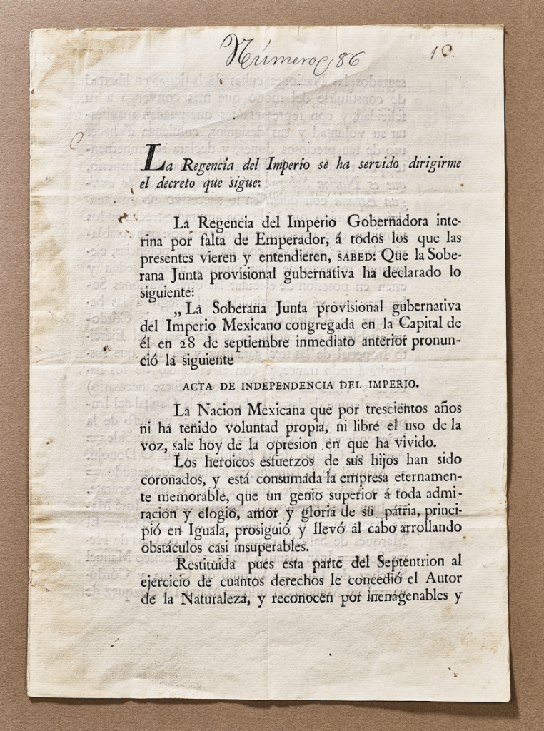 1821 – La Regencia Del Imperio Se Ha Servido Dirigirme El Decreto Que Sigue…Acta De Independencia Del Imperio (Mexican Declaration of Independence from Spain)