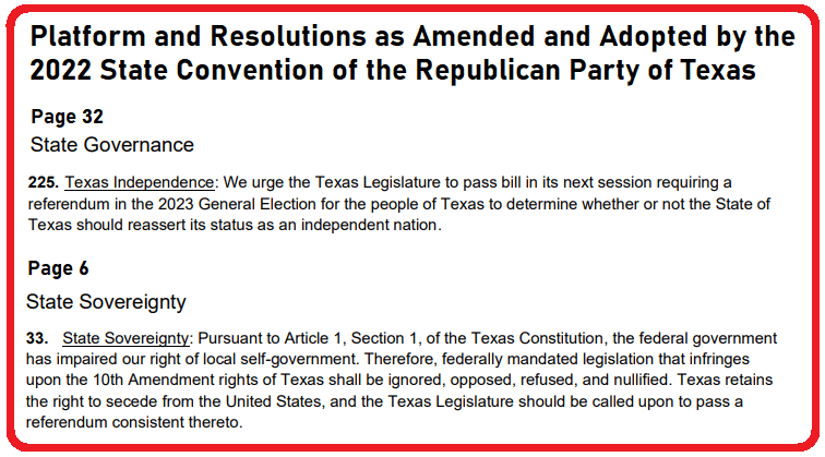 2022 – Texas State Republican Convention approves Planks 33 and 225, calling for the TEXIT referendum to be on the 2024 Republican primary ballot.