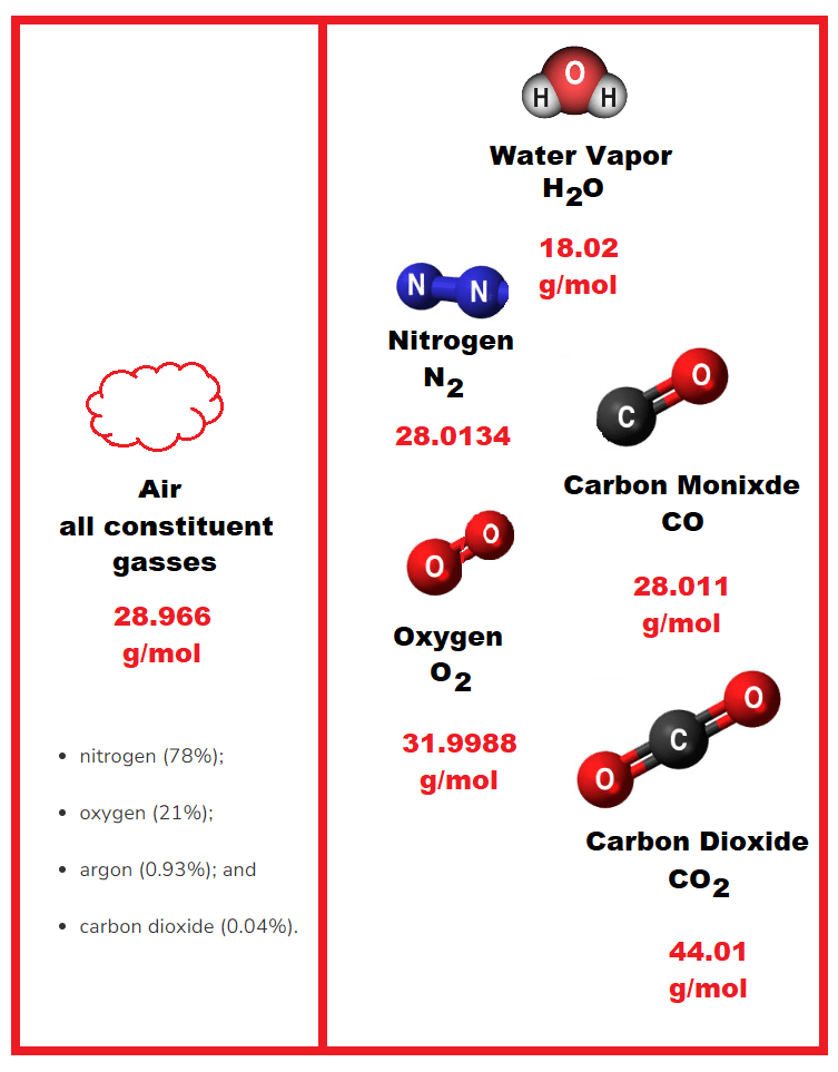 The chart below stacks the constituent gasses of our atmosphere in order of molecular weight. For the sake of simplicity and to help your understanding of the role of CO2, not all the gasses in the atmosphere are shown.