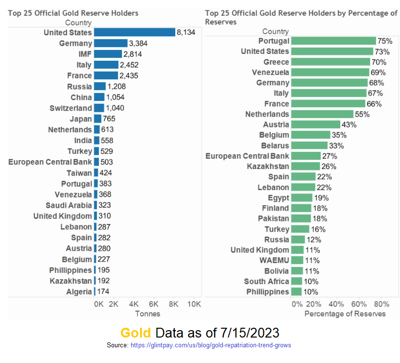 “The tangled tale of Venezuela’s gold reserves holds some lessons which other countries are apparently taking note of. In recent years, the South American oil-rich country has suffered from severe hyperinflation (reaching more than 34,000% per year) and the inevitable social malaise that brings. Four years ago, the UK government recognized Juan Guaido as Venezuela’s President after the country’s National Assembly declared the incumbent Nicolas Maduro’s 2018 re-election invalid. Venezuela’s National Assembly declared its president, Guaido, to be President of the country. Guaido called for an uprising (which failed) in 2019 against Maduro, who continued to control state institutions. Initially a popular domestic figure, Guaido gained early support from the US, the European Union, and the UK, who saw him as a sympathetic and democratic leader. However, leading opposition parties voted to oust Guaido last year, and his interim government was dissolved last December, with fresh Presidential elections planned for 2024. Guaido is no longer recognized by the British government as Venezuela’s leader.” read more Gold Repatriation Trend Grows | by Gary Meade, GLINT, July 11, 2023