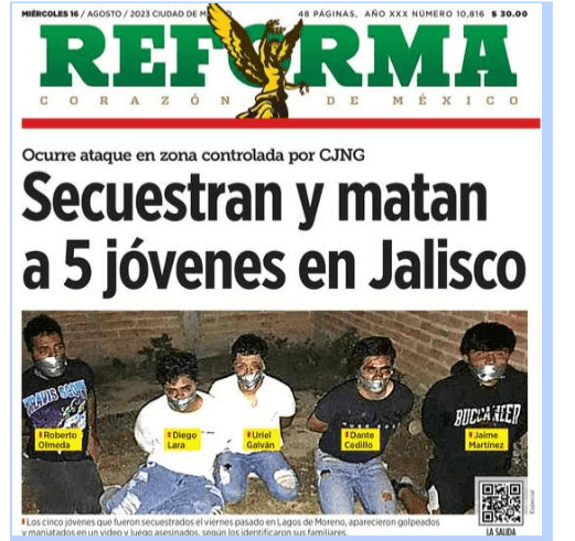 Cinco amigos de Lagos de Moreno, en el estado occidental de Jalisco, planeaban asistir a la feria local un viernes por la noche reciente. En lugar de ello, desaparecieron: un destino cruel que azotó a miles de mexicanos. En las redes sociales aparecieron fotos de los jóvenes ensangrentados y atados de rodillas. Luego apareció un vídeo en el que los amigos se veían obligados a atacarse entre sí.