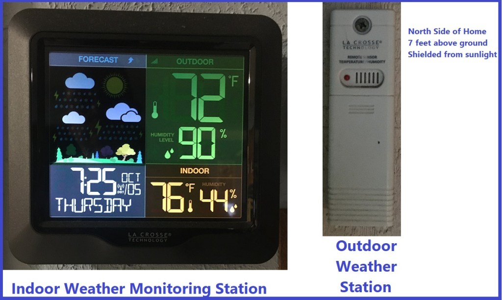 On 10/5/2023, at 0730 hours, in Rockwall, Texas, the NWS indicated 69°F, 100% relative humidity. My own weather station indicated 72°F, 90% relative humidity. My outdoor sensor is on the north side of my home, 7 feet above the ground, and shielded from sunlight.