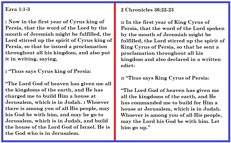 - Some scholars discern the Chronicles are a continuation of the book of Ezra. “The first two and a half verses of the Book of Ezra (Ezra 1:1–3) (537 BC) are identical to the last two verses of the second Book of Chronicles (2 Chronicles 36:22–23) (609 BC).”Ref