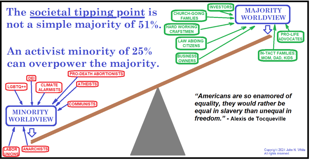Yes, a 25% minority of activists can override the will of the complacent majority. A highly motivated body of patriots led the 13 colonies in revolt against Great Britain. Three activist groups came together to “tip” the balance of power in favor of the revolution. This is a good instance of a societal tipping point.