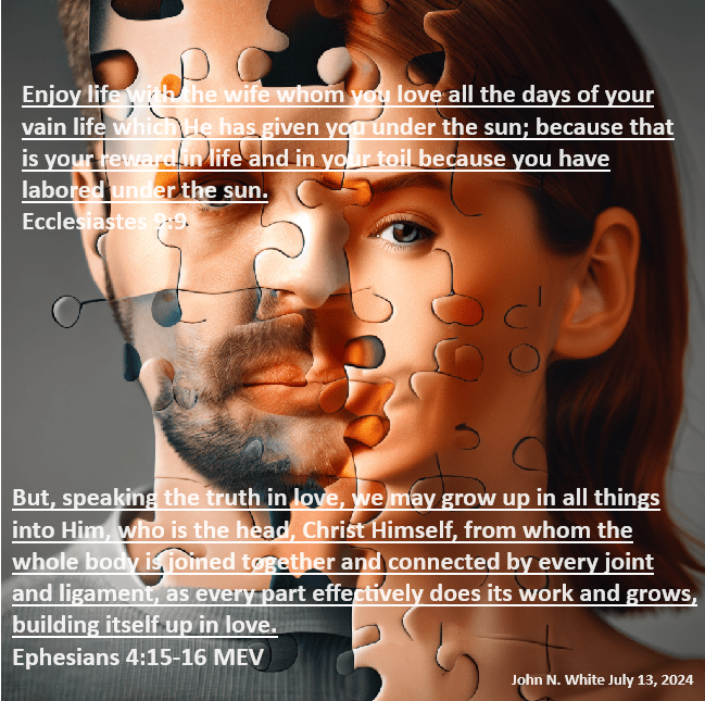 The marriage of a man and a woman is a small-scale model of the marriage of Jesus Christ and his bride, the ekklēsia, the church. I quote from Ephesians 5:23-27 MEV
